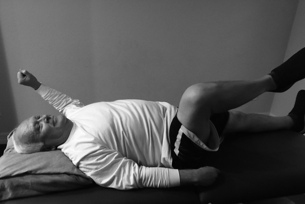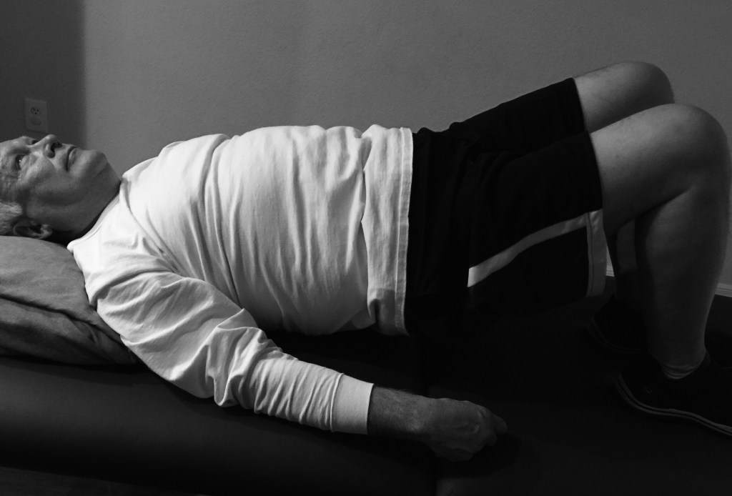 Bridges: with back flat on the table or support surface and knees bent, draw belly button down to toward spine. Slowly lift pelvis up off surface so that the pelvis. Hold for 5 seconds. Slowly lower return to start position. Repeat 15 times.