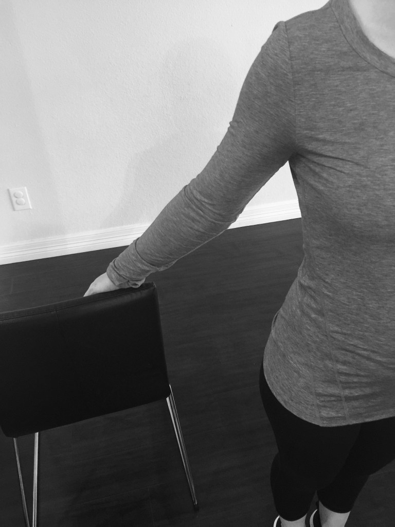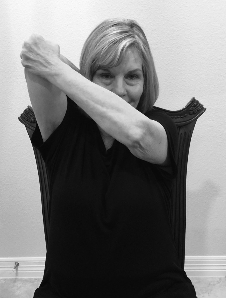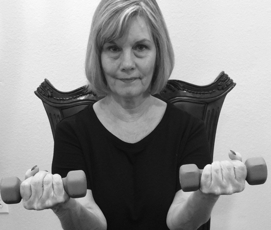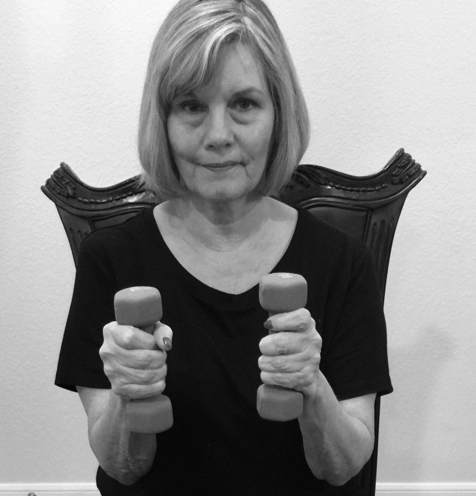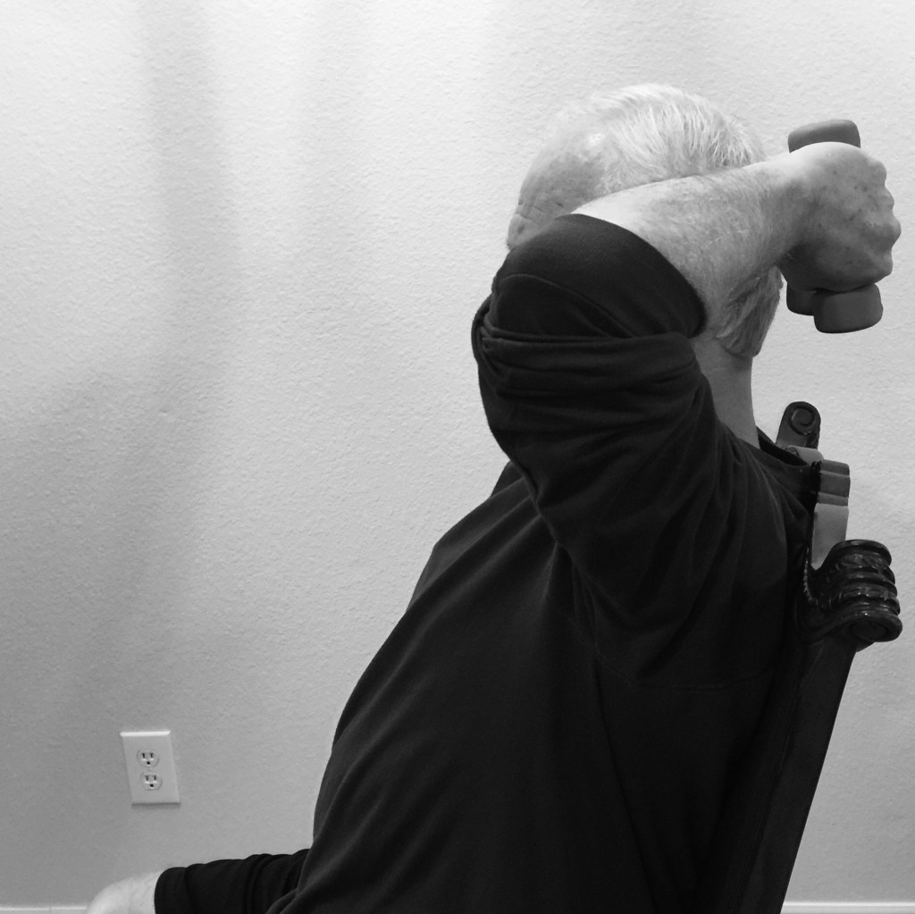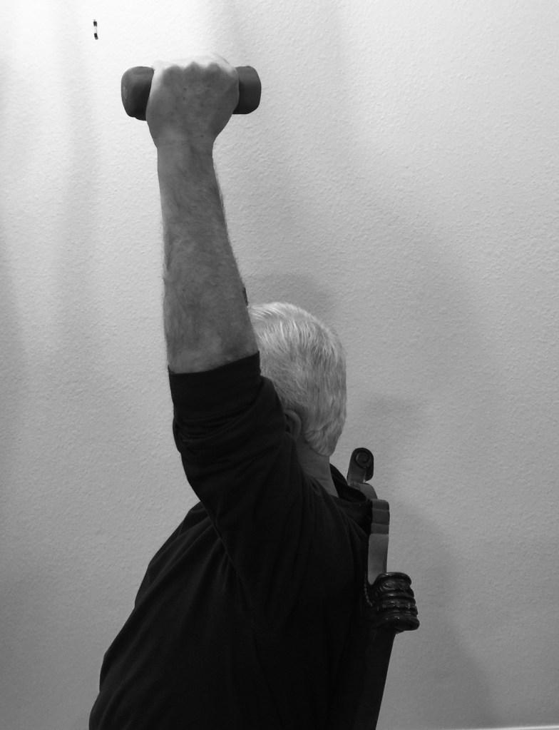 Triceps extension: With arms bent and holding weight behind head, straighten arms so that elbows extend and the hand/weight is drawn upward; slowly return to start position. Repeat 15 times.