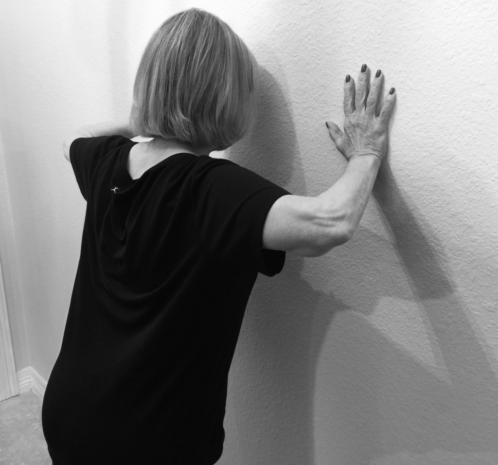 bent position and feet slightly away from the wall;